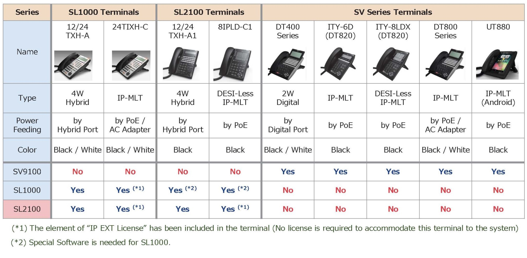 IP PBX NEC SL1000 และ IP PBX NEC SL2100 ลักษณะการออกแบบทั้ง 2 รุ่น จะเป็นแบบ Multiline Terminal ซึ่งสามารถใช้งานทดแทนกันได้ ซึ่งต่าง SV Series ที่ไม่สามารถนำมาใช้กับ Series SL ได้ ต่อมาเรื่องการจ่ายไฟสำหรับ เครื่องโทรศัพท์แบบ IP Phone ใน IP PBX NEC SL1000 และ IP PBX NEC SL2100 สามารถรองรับการจ่ายไฟผ่าน Switch PoE ได้ แต่ในรุ่นของ IP PBX NEC SL1000 จะมี Port สำหรับเสียบ Adaptor มาให้ด้วย และสำหรับ เครื่องโทรศัพท์แบบ IP Phone ของ SV Series การจ่ายไฟสำหรับสามารถรองรับการจ่ายไฟผ่าน Switch PoE ได้ทุกรุ่น (ตามภาพประกอบ) สำหรับ Port เสียบ Adaptor ในเครื่องโทรศัพท์แบบ IP Phone ของ SV Series จะมีเพียงเฉพาะรุ่น DT800 Series เท่านั้นที่มี