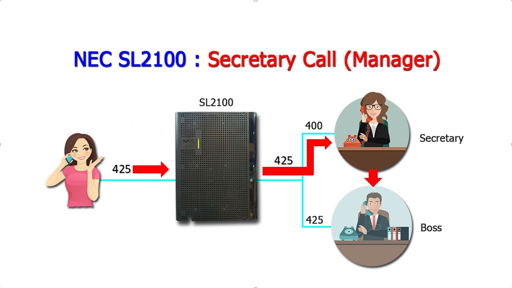 วันนี้เราจะมาแนะนำ Feature ของ NEC SL2100 สำหรับ สำนักงานที่มีผู้จัดการ(Boss) และมีเลขา(Secretary) ทำหน้าที่รับเรื่องทุกเรื่องก่อนนำเสนอผู้จัดการ(Boss) คือ Feature Secretary Call (Manager) เมื่อเราตั้งค่า Feature เสร็จแล้วถ้ามีสายเรียกมาเข้าที่ผู้จัดการ(Boss)ระบบตู้จะทำการโอนสายมายังเลขา(Secretary) เมื่อคุยรับเรื่องเรียบร้อยแล้วโอนต่อให้ผู้จัดการต่อไป สำหรับการตั้งค่า Feature ไม่ยากครับ