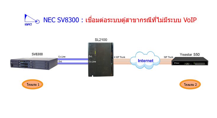โดยใช้ NEC SL2100 เป็นเสมือน Gateway แปลงสัญญาณจากสายใน และ สายนอก ของระบบตู้สาขาเก่าคือตู้ NEC SV8300 เป็น SIP Trunk และส่งไปยังระบบตู้สาขา IP PBX ที่จะติดตั้งใหม่ สามารถโทรหากันได้โดยผ่าน SIP Trunk ของตู้ NEC SL2100