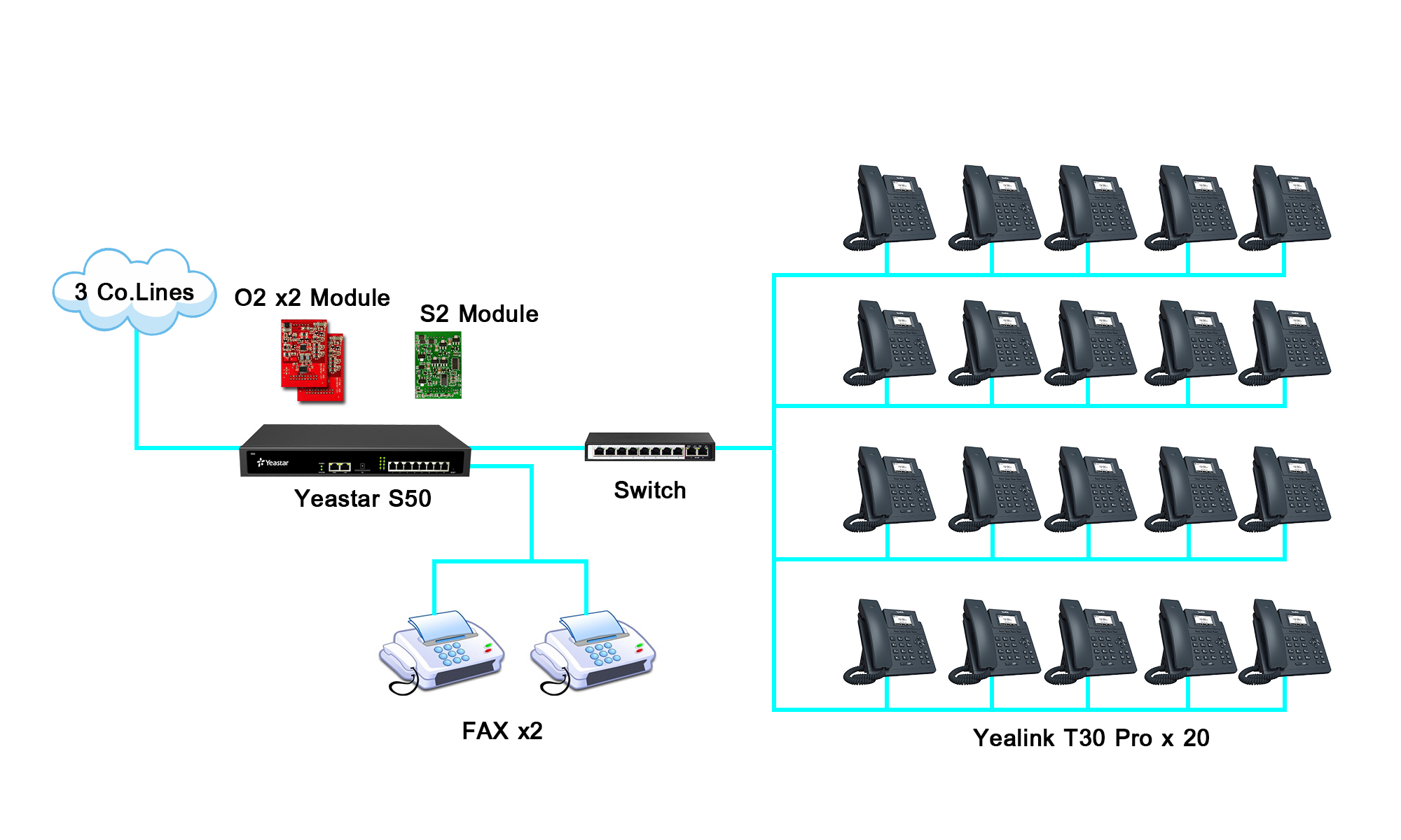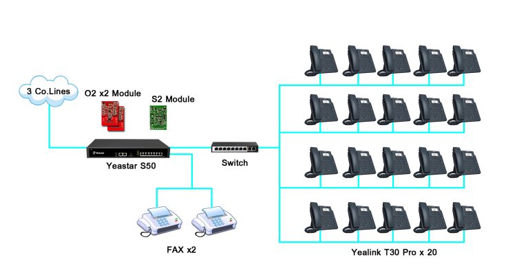 เราออกแบบเป็น Yeastar S50 เพิ่มสายนอกด้วย O2 Module 2 การ์ดและ S2 1 การ์ด รวมเป็น 6 เบอร์ ใช้เป็นสายนอก 3 เบอร์, Fax 2 เบอร์ สายในใช้ IP Phone Yealink T30 20 เบอร์ ซึ่ง IP PBX รุ่นนี้รองรับ SIP Ext 50 ได้เบอร์ เพื่อลูกค้าจะใช้เบอร์เพิ่มเติมได้อีก