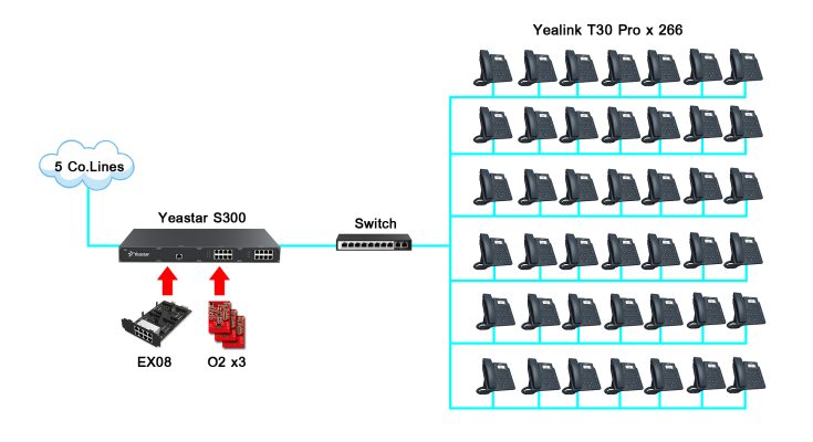 เราออกแบบเป็น Yeastar S300 เพิ่ม EX08 Card เป็น Slot สำหรับใส่ Module O2, S2, SO และเพิ่มสายนอกด้วย O2 Module 2 การ์ด  S2 Module 1 การ์ดรวมเป็น 6 เบอร์ ใช้เป็นสายนอก 5 เบอร์, สายในใช้ IP Phone Yealink T30 266 เบอร์ ซึ่ง IP PBX รุ่นนี้รองรับ SIP Ext 300 ได้เบอร์ เพื่อลูกค้าจะใช้เบอร์เพิ่มเติมได้อีกในอนาคต