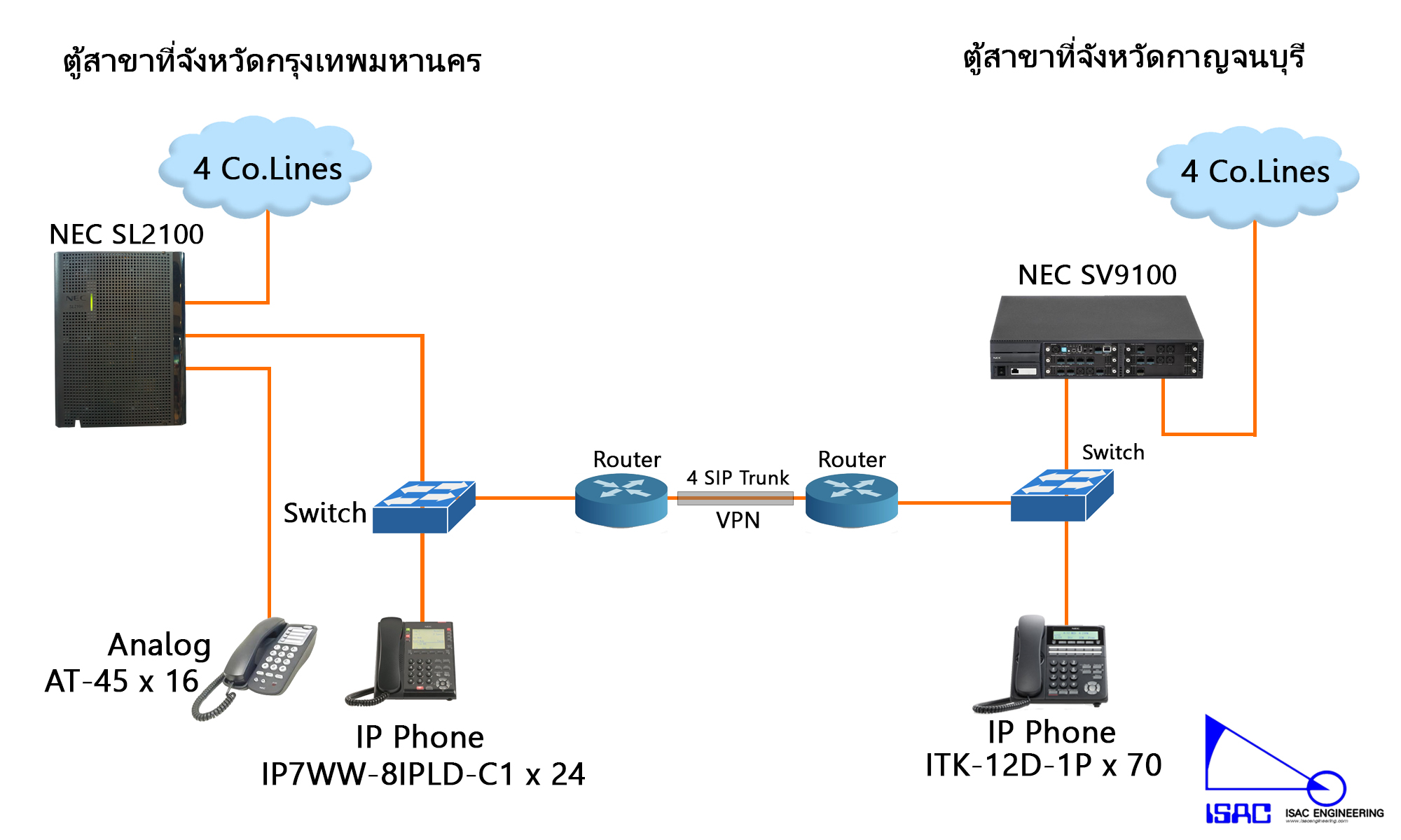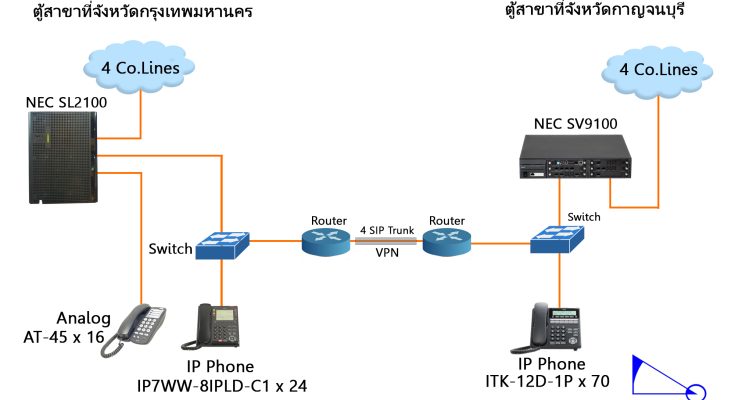 Diagram : นำเสนอการเชื่อมต่อระหว่างสาขาตู้สาขา NEC SL2100 & NEC SV9100 ด้วย 4SIP Trunk โทรหากันฟรีไม่มีค่าใช้จ่าย โดยกดเป็นเบอร์ภายในได้ 4 คู่สาย
