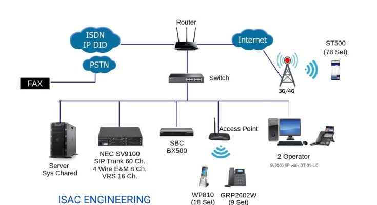 ตู้สาขา NEC SV9100 พร้อม Additional options ต่างๆ มีทั้งเครื่อง WiFi Phone และยังมีเรื่องของการใช้ Application Mobile ST500 ของตู้สาขา NEC SV9100 ใช้จำนวน 78 Set.Capacity : 60 SIP Trunk / 8E&M / 209 Softphone / 78 Mobile ST500 / 2 PC Operator / 27 IP Phone