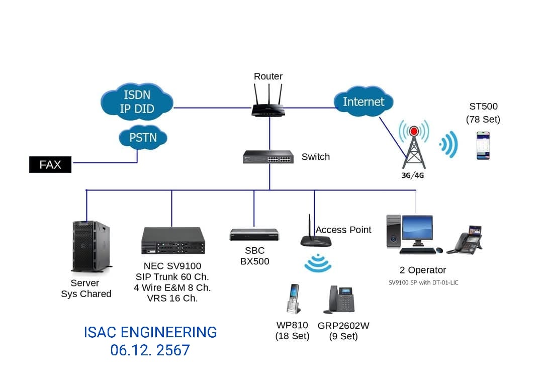 ตู้สาขา NEC SV9100 พร้อม Additional options ต่างๆ มีทั้งเครื่อง WiFi Phone และยังมีเรื่องของการใช้ Application Mobile ST500 ของตู้สาขา NEC SV9100 ใช้จำนวน 78 Set.Capacity : 60 SIP Trunk / 8E&M / 209 Softphone / 78 Mobile ST500 / 2 PC Operator / 27 IP Phone